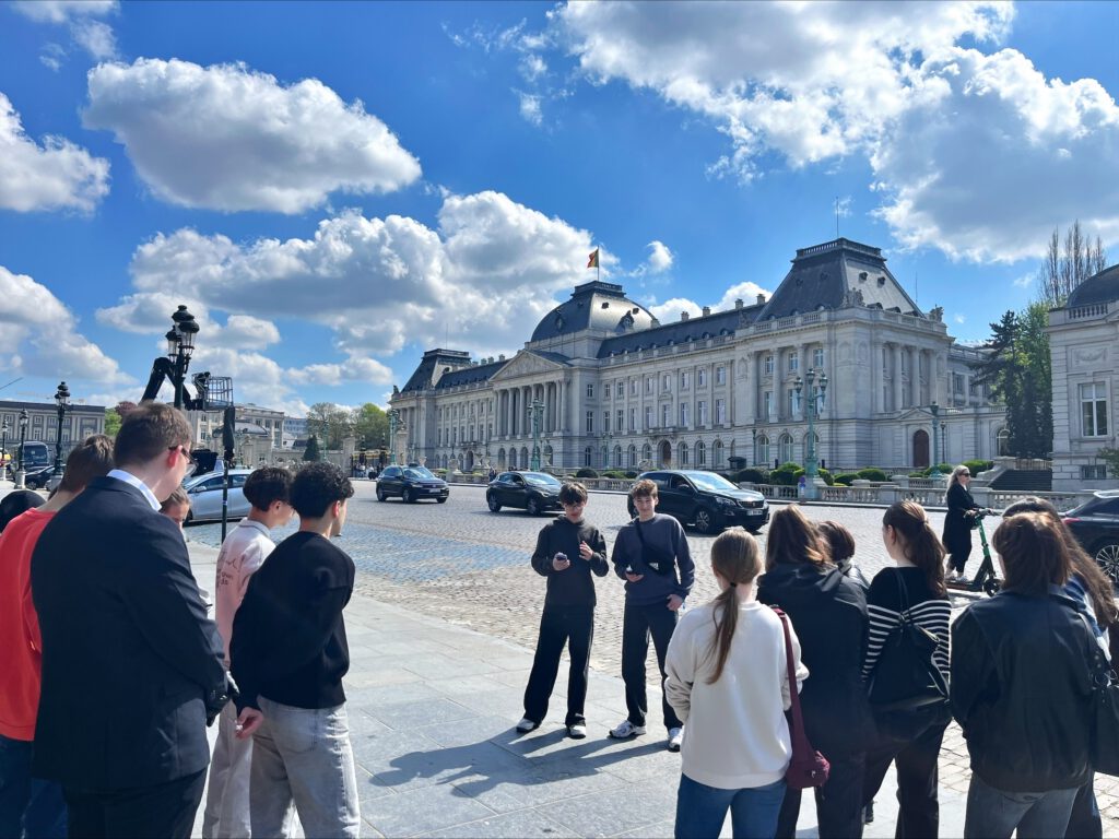 Nach dem Frühstück ging es für uns heute, am 14.04., das erste Mal ins „Europa-Viertel“. Dort waren wir mit dem EU-Abgeordneten Tiemo Wölken im Zweig-Haus verabredet. Nach einem Securitycheck ging es aber erstmal mit einer Einführung zu der Arbeit der EU los, in der wir unter anderem über die drei Organe der EU aufgeklärt wurden. Ab diesem Punkt stieß dann auch Herr Wölken aus einer Ausschusssitzung zum Thema Gesundheit zu uns und wir sprachen über aktuelle Themen wie KI, die E-Mobilität und auch den Iran-Krieg. Anschließend besuchten wir das Gebäude des Europäischen Parlaments einschließlich des Plenarsaals. Im Anschluss begannen wir eine selbstorganisierte Stadtführung, bei der alle Schülerinnen und Schüler zu einer der Sehenswürdigkeiten in kleinen Gruppen Recherche betrieben und diese bei der Stadtführung vorgestellten. Begonnen haben wir beim Jubelpark, gingen über die Kathedrale St. Michelle und St. Gundula, dem Königspalast, dem Porte de Hal und dem Justizpalast zum Manneken Pis, einem besonderen Wahrzeichen der Stadt. Vom Manneken Pis aus teilten wir uns auf und genossen unsere Freizeit bis zum Abend.